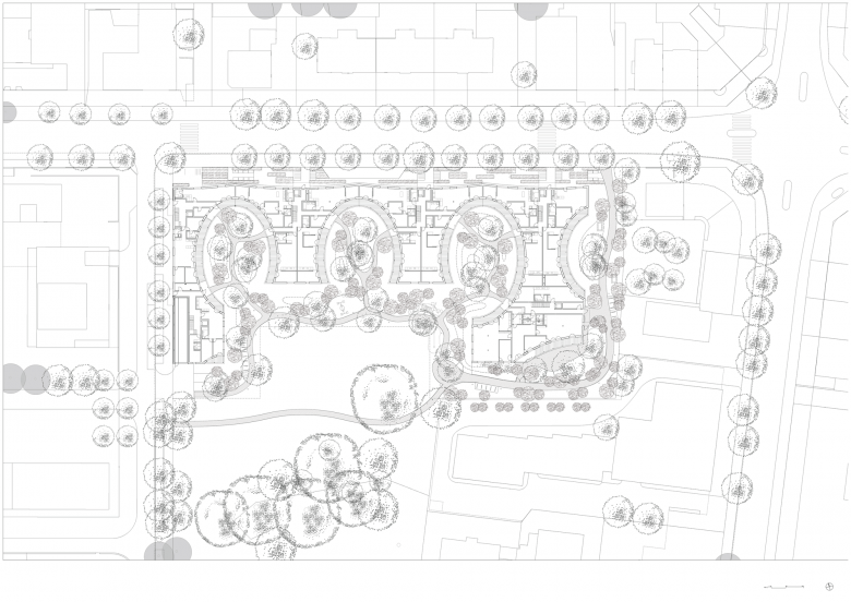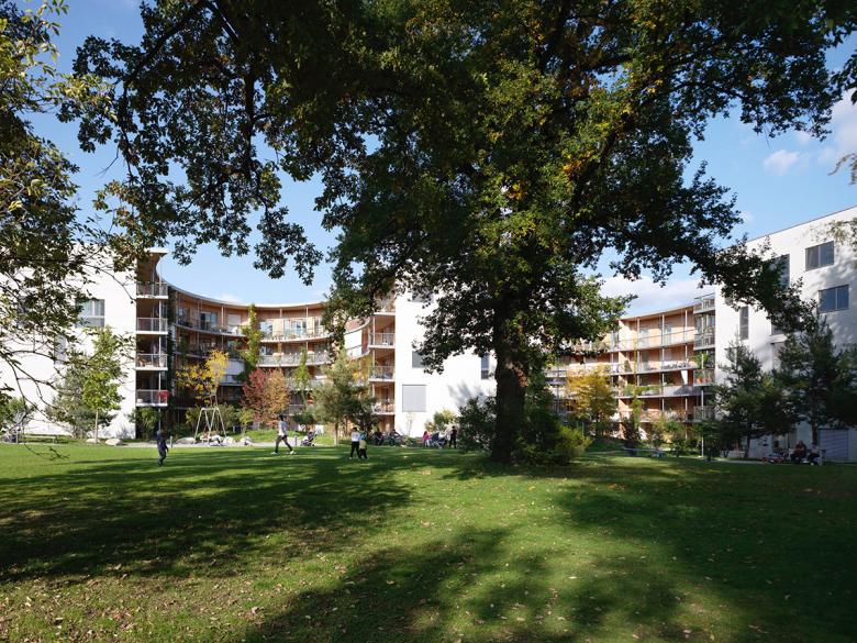 Drei ovale Höfe empfangen den Park mit seinem wertvollen Baumbestand und überführen das Parkthema differenziert in eine der Siedlungsgemeinschaft dienende Nutzung.