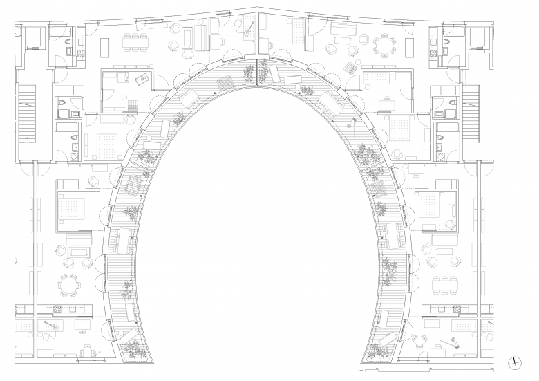 Gegen die Nachbargebäude im Osten reagiert die Matrix mit einem halben Oval und komplettiert den bestehenden halben Hof zu einer neuen Einheit, einem vierten Hof. Im Südosten besetzt der Baukörper die gesamte Parzellentiefe, nimmt das Thema der ‚Gebäude in zweiter Reihe' spielerisch auf und fügt sich in die vorhandene Morphologie ein.