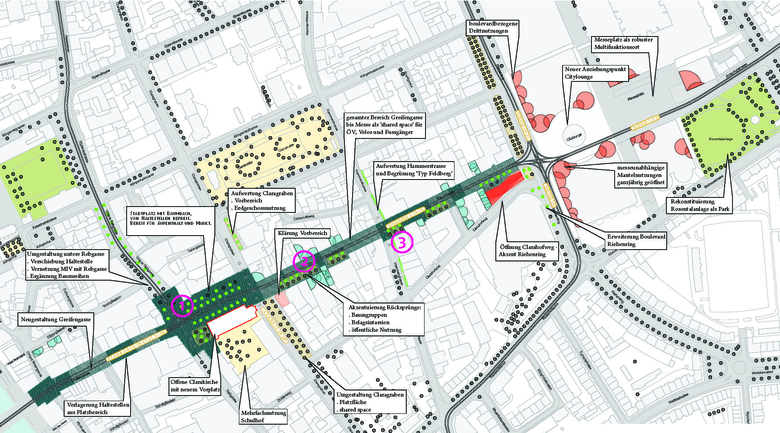 Die Handlungsfelder reichen vom kreativen Rückbau bestehender Strukturen, einer Neuordnung der Bus- und Tramhaltstellen an Knotenpunkten bis zur Neubesetzung von umliegenden Entlastungsbändern. Auch sollen neue raumbildende Elemente wie Begrünungen, Beleuchtungen und architektonische Akzente gesetzt, Erdgeschosse an hochfrequentierten Lagen umgenutzt, innerstädtische Räume neu verbunden und ein eigentliches ‘Branding’ zur Betonung spezifischer Atmosphären und Identitäten geschaffen werden.
