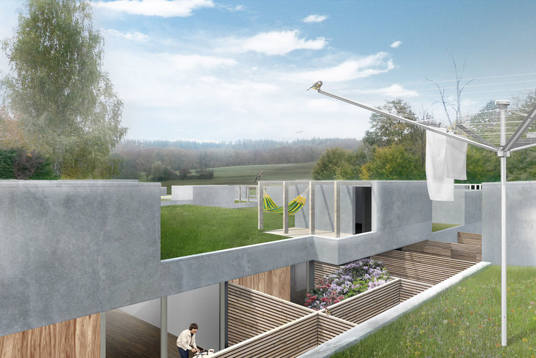 Die Wohnungen zeichnen sich durch ein vielfältiges Angebot an inneren und äusseren Räumen mit differenziertem Öffentlichkeitsgrad aus. Jede Wohnung grenzt mit einem grosszügigen Vorzimmer an das System der öffentlichen Wege und Plätze. Das gemeinschaftliche Zentrum der Wohnungen sind die überhohen Atriumküchen mit ihren Oblichtern. Sie grenzen an die Wohn-zimmer, welche sich über Schiebetüren und eine breite Veranda auf den Garten öffnen. Die privaten Zimmer schliesslich grenzen mit raumhohen Fenstertüren an intime, kleine Patios. Dieses erd-geschossige Raumangebot wird ergänzt durch eine einfache Dachlaube mit Wasser- und Elektroanschluss, welche als Lagerraum, Waschküche oder Bastelraum dient. Vom Haupteingang oder vom Garten her erschliessen im Vordach eingelassene, ausklappbare Estrichtreppen die Dachlauben und je eine kleine Dachterrasse. Das Raumsystem der Plätze, Gärten, Patios, Veranden und Terrassen eröffnet vielfältige Aneignungspotenziale. Das Wohnen beschränkt sich nicht auf das Innere der Häuser – die öffentlichen Plätze werden mit Blumentöpfen oder Pingpongtischen möbliert, in den Gärtenwachsen Blumen und Kräuter, auf dem Dach hängt Wäsche zum Trocknen und im Patio wird vielleicht die neue Modelleisenbahnanlage aufgebaut. Trotz der kompakten inneren Nutzflächen bieten die Wohnungen ein vielfältiges Angebot an Raumproportionen, Lichtsituationen und Ausblicken. Der dicke Dachaufbau mit leichtgewichtigem Substrat garantiert im Sommer und im Winter ein angenehmes Raumklima. Dank der eingeschossigen Bauweise sind sämtliche Zimmer aller Wohnungen vollständig schwellenlos erreichbar.