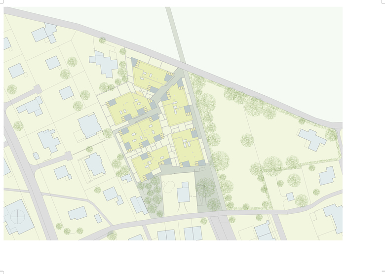 Die vorfabrizierte Holzbauweise setzt auf einen nachwachsenden Baustoff und zeichnet sich durch einen sehr niedrigen Grauenergieverbrauch aus. Der Mon-tagebau mit seinen auswechselbaren Teilen vereinfacht zudem im Vergleich zu einer Massivbauweise mögliche spätere Anpassungen. In den Holzelementen werden Zonen für die Führung von Elektro- und Kommunikationsleitungen definiert. Die Erschliessung für Wasser und Heizung sowie die Entwässerung kann dank der eingeschossigen Bau-weise überall problemlos unter den Häusern erfolgen. Ein zentraler Tech-nikraum in der Garage bedient die ganze Siedlung. Die Lüftung erfolgt in den Bädern und Küchen durch zentrale, hygrostatisch gesteuerte Abluftventilatoren mit Wärmerückgewinnung. Anstelle einer geführten Zuluft schlagen wir ein einfaches und bewährtes System mit im Fensterdetail integrierten Nachströmöffnungen vor. Dank den kompakten Dämmperimetern und dem gut gedämmten Dach erreichen die Häuser trotz der niedrigen Bauhöhe nicht allein den geforderten Minergiestandard sondern sogar die strengeren Anforderungen nach Minergie P. Damit reduziert sich der Primärenergiebedarf Dank den kompakten Dämmperimetern und dem gut gedämmten Dach erreichen die Häuser trotz der niedrigen Bauhöhe nicht allein den geforderten Minergiestandart sondern sogar die strengeren Anforderungen nach Minergie P. Damit reduziert sich der Primärenergiebedarf