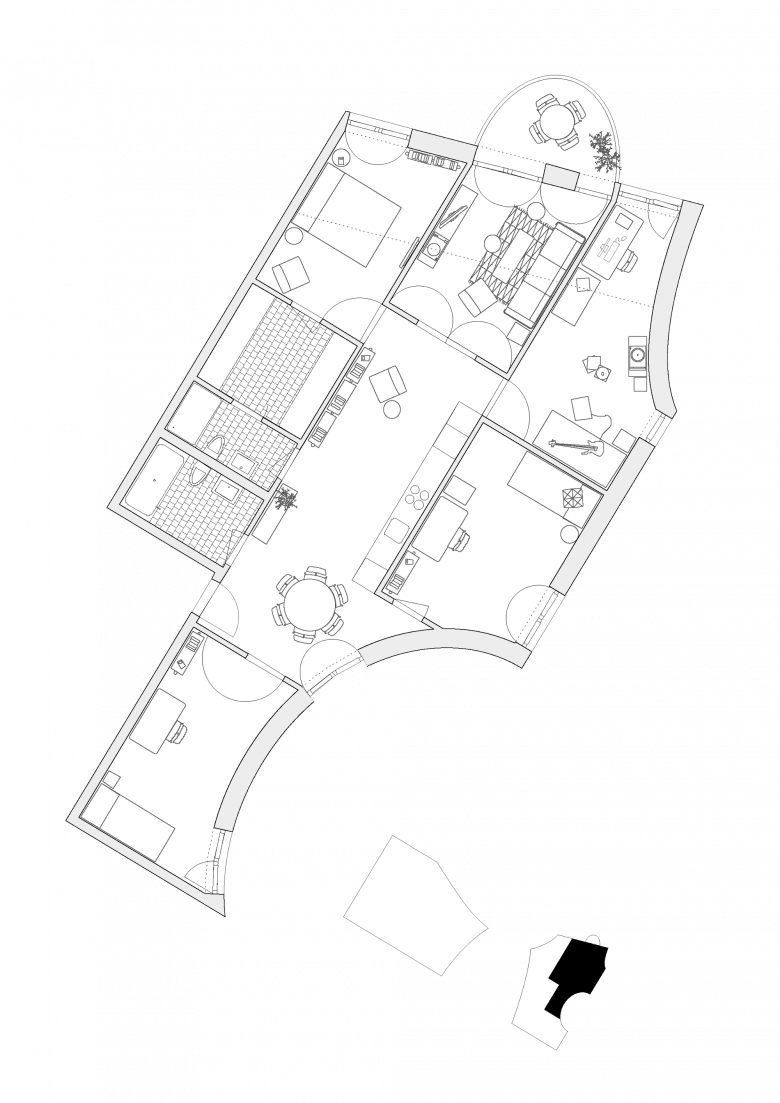 Die 4 ½ Zimmerwohnungen besitzen einen T-förmigen, zentralen Wohnraum, von dem bei Bedarf ein Teil als Individualzimmer abgetrennt werden kann.