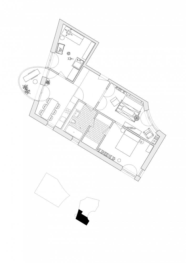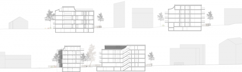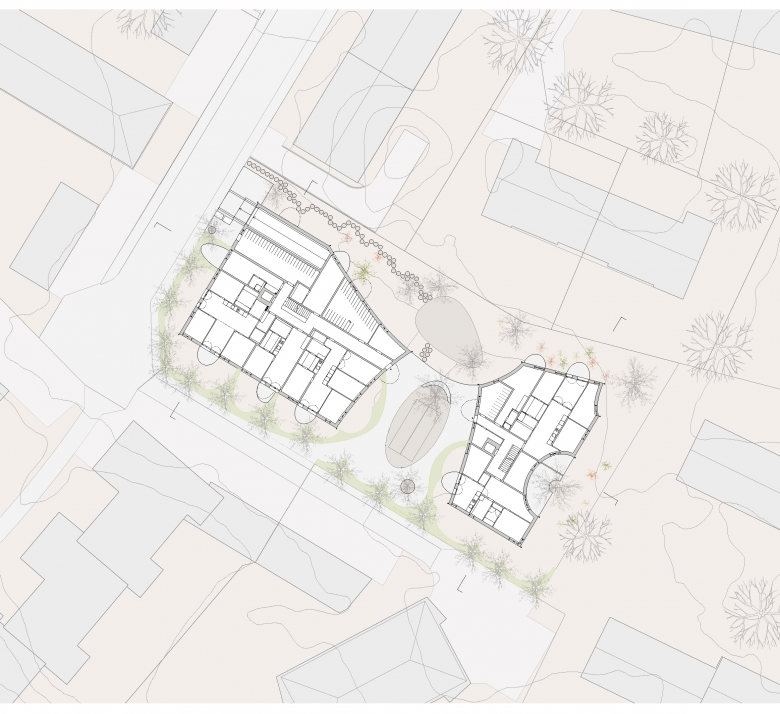 Die diagonal verlaufenden Dachlinien nehmen die Richtung der zwei solitär stehenden höheren Häuser im Süden auf. Mit der Kreuzung aus Flachdach und Firstdach wird volumetrisch auf die unterschiedlichen Höhen der umliegenden Gebäude eingegangen und die vorherrschenden Dachformen werden einer Neuinterpretation unterzogen.