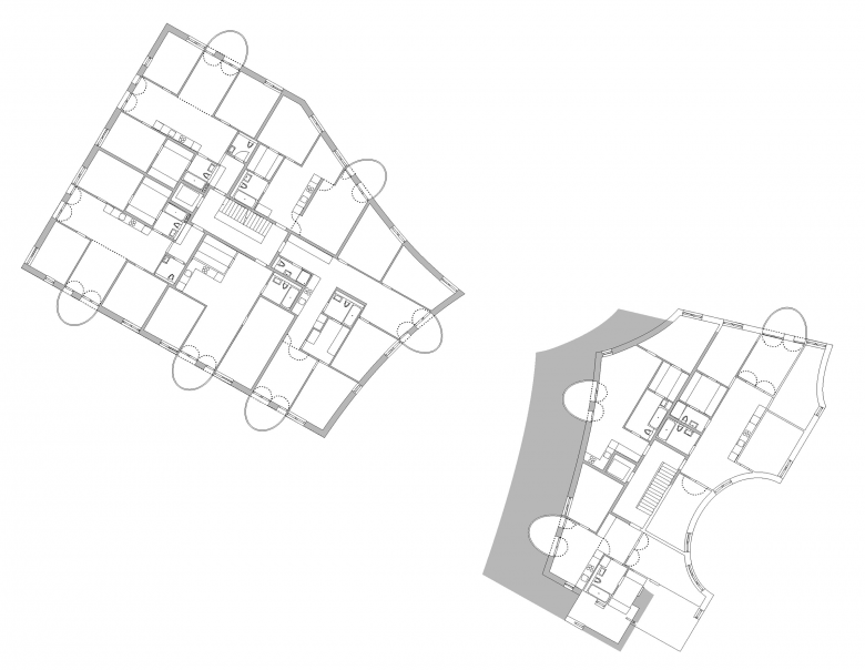 Das Haus 1 an der Rautihalde folgt der Baulinie, besetzt die Ecke und schwingt sich dort zu einem fünfgeschossigen Baukörper auf. Der zweite, westliche Bau an der Seitenstrasse zeigt sich gegen den gemeinsamen Binnenraum mit fünf Geschossen und fällt gegen die westlichen und nördlichen Nachbarhäuser hin ab.