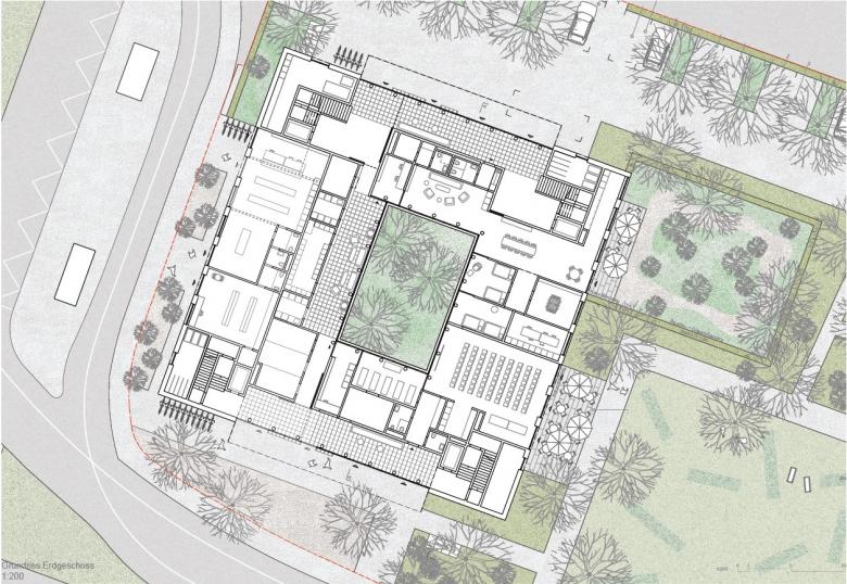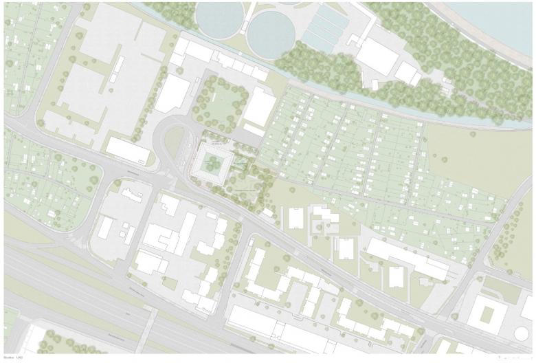 Die städtebauliche Setzung des Neubaus als Hochpunkt zum öffentlichen Raum spielt einen grossen Teil der im Bestand bebauten Fläche frei. Dies wir genutzt um die Topografie wieder auf den im Programm beschriebenen ursprünglichen Verlauf zurückzubauen, um den neuen Aussenraum als Verbindungsglied vom Strassenraum der Bändlistrasse hin zu den rückwärtig gelegenen Bauten in Bezug zu setzen. Gleichzeitig wird es möglich vormals abgeschnittene Wegverbindungen wieder zu aktivieren und die Durchlässigkeit des Areals zu erhöhen.