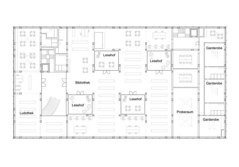 Die vier Programmpunkte des komplexen Raumprogramms (Einkaufen, Wohnen/Gemeindesaal/Bibliothek und Ludothek) wurden mit einem gemeinsamen architektonischen Thema facettenreich formuliert. Während die Erdgeschosse als flexible, offene Hallen konzipiert sind, haben die darüberliegenden Geschosse eine relativ engmaschige Tragstruktur. Der Saal bleibt dank des räumlichen Fachwerks der Bibliothek, welches an nur vier Punkten abgestützt werden muss, komplett stützenfrei.