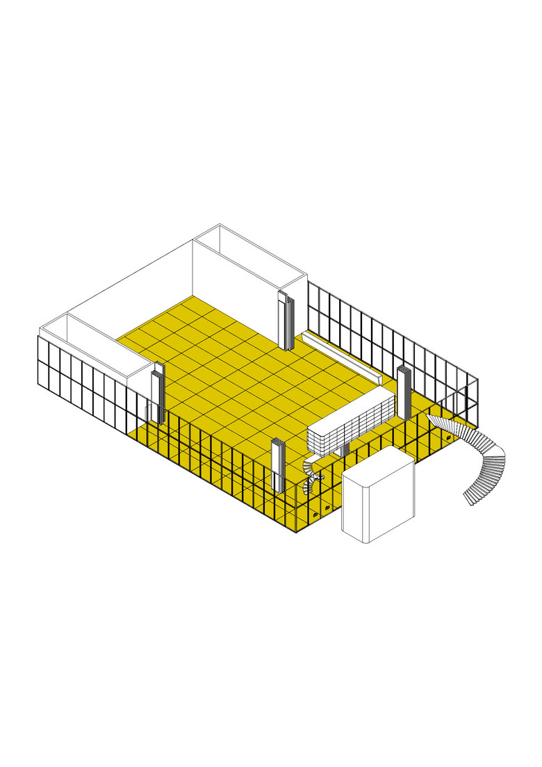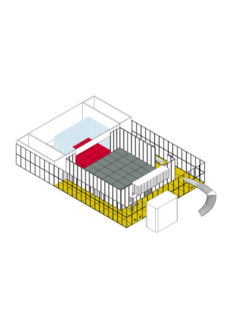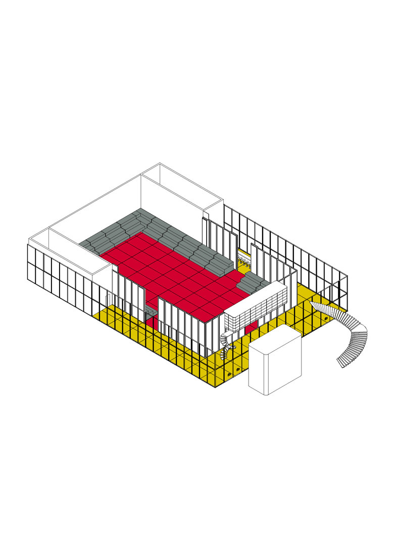 Die Flexibilität des Saales erlaubt unterschiedlichste programmatische Szenarien und dient damit ‚mehreren Zwecken’.