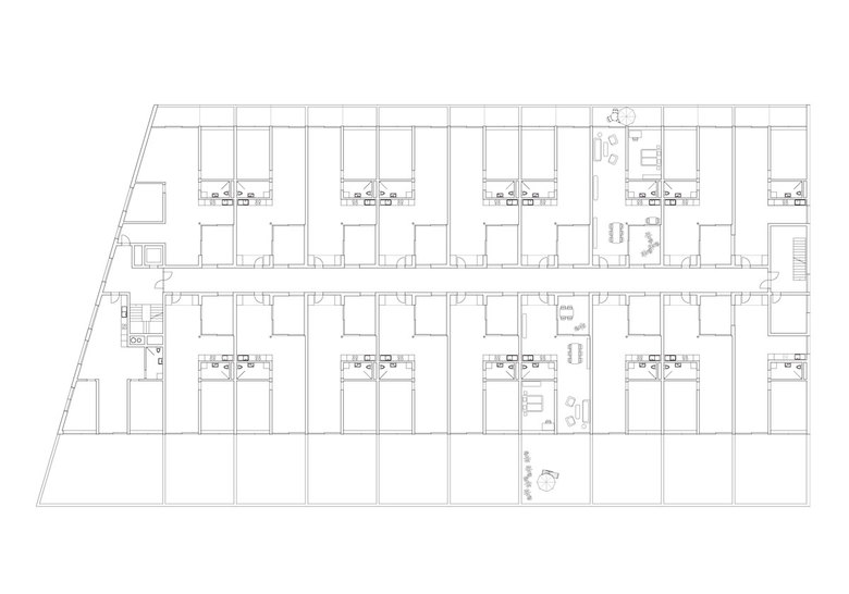 Die Hallenkonstruktion des Marktes funktioniert mit einem optimalen Stützenraster von bis zu 10.5 Metern als Tisch mit einer kassettierten Decke. Die beiden darüberliegenden Wohngeschosse werden in Schottenbauweise mit einem wirtschaftlichen Achsmass von 3.50m als Holzkonstruktion gebaut.
