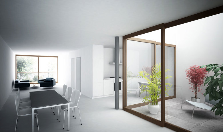 Die Alterswohnungen sind in zwei Geschossen über dem Grossverteiler untergebracht. Im ersten Obergeschoss befinden sich die Zweizimmerwohnungen, welche von einem über die Patios natürlich belichteten ‚Hotelgang’ erschlossen sind. Die Wohnungen selbst sind gegen Osten oder Westen orientiert. Sie sind durch vielfältige Aussenraumbeziehungen gekennzeichnet: Neben den grosszügigen Terrassen besitzen die Wohnungen einen zusätzlichen Patio, welcher Küche und Eingangsbereich belichtet und wo man sich an heissen Sommertagen an die Kühle zurückziehen kann. Im Winter wird dieser Patio durch Schliessen des Glasdaches zum Wintergarten. Die Dreizimmerwohnungen im 2. Obergeschoss sind analog ebenfalls mit aussenliegender Terrasse und innenliegendem Patio ausgestattet.