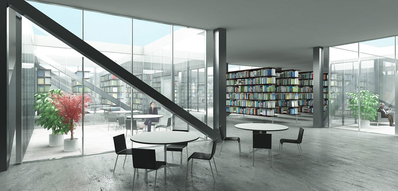 Via Lift und über die hängende Freitreppe erreicht der Besucher einen offenen Lichthof im Obergeschoss. Von dort erschliessen sich auf der einen Seite die Ludothek, auf der andern die Bibliothek. Die vier Innenhöfe versorgen den Bibliotheksraum in Ergänzung mit den Oblichtern mit optimalem Tageslicht und dienen als erweiterte Lesebereiche im Sommer. Im Winter werden sie durch verschiebbare Dachverglasungen zum Wintergarten. Die Introvertiertheit der Bibliothek gewährt eine ruhige Grundstimmung abseits von Hektik.