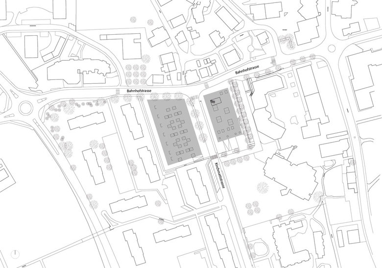 Das gegebene Raumprogramm füllt die beiden zur Verfügung stehenden Parzellen bis fast an deren Rand. Es brauchte daher gezielte Massnahmen, um Raum für die Öffentlichkeit freizuspielen. Während ein bereits existierender Dorfplatz aus den 70er/80er Jahren eher einem introvertierten Hinterhof gleicht, leistet die Setzung der beiden neuen Zentrumsbauten einen Beitrag zur Klärung der Hierarchien im öffentlichen Raum und etabliert die Bahnhofstrasse als erste Adresse von Steinhausen. Analog der schon bestehenden öffentlichen Vorplätze, welche abwechselnd links und rechts entlang der Bahnhofstrasse aufgereiht sind, docken die Bauten mit einem gedeckten Eingangsbereich für Markt und Wohnungen einerseits und einem grossen gedeckten Platz vor Saal und Bibliothek andererseits an diese neu definierte Hauptachse von Steinhausen an.