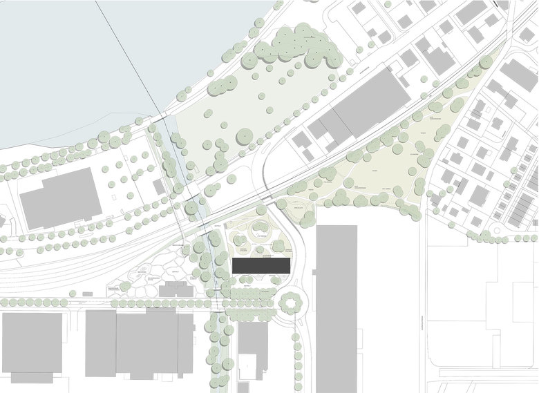 Das neue Hochhaus bildet den vorläufigen Schlusspunkt der geplanten Stadtkante von Arbon. Die Setzung der Hochhausscheibe im hinteren Drittel der Parzelle hat aber gleichermassen auch eine weiterleitende Wirkung, indem die drei Freiräume ‚Park Steinach’, das leicht erhöhte ‚Belvedere’ vor dem Hochhaus und der Stickereiplatz räumlich grosszügig zusammengefasst werden. Damit werden Arbon und Steinach städtebaulich miteinander verbunden.
