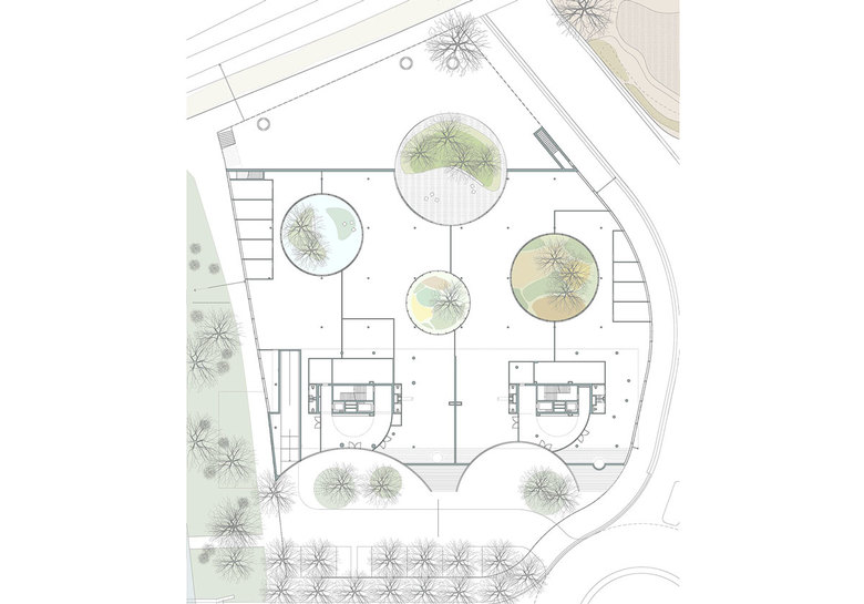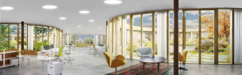 Die Büros sind auf einer einzigen, durchgehenden Ebene im Erdgeschoss organisiert und bieten schöne Blickbezüge auf den Stickereiplatz im Norden, den Steinacher Park im Süden und das dem See vorgelagerte Naturschutzgebiet im Osten. Zusätzlich sorgen grosse, runde und raumhoch verglaste Innenhöfe für eine gute Belichtung der Büroflächen. Verschiedenartige Pflanzen und Bäume in den auch dem Aufenthalt dienenden Höfen erzeugen eine angenehme Arbeitsatmosphäre. Die Unterteilung der Gesamtfläche ist dabei in hohem Mass flexibel und kann sowohl verschiedene Mieter als auch eine einzige Firma aufnehmen.
