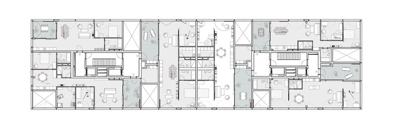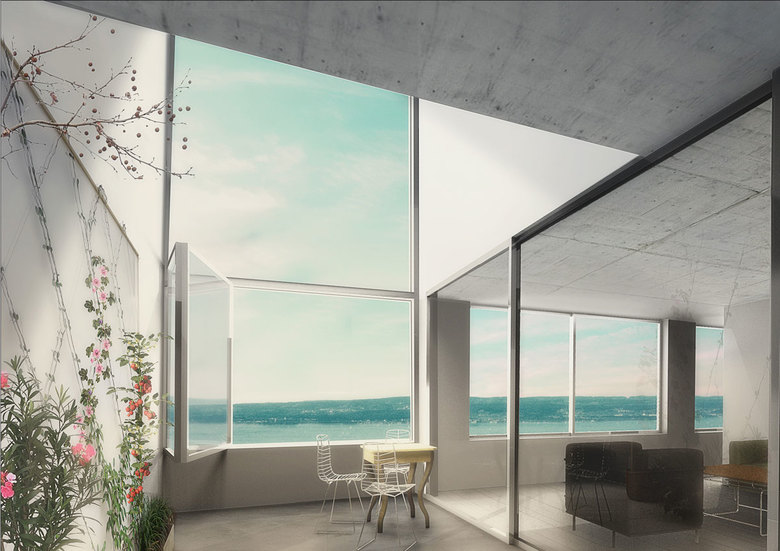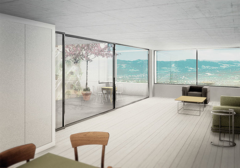 Die Atmosphäre der Wohnungen wird durch ein gemeinsames räumliches Thema bestimmt. Ausgehend von der Überlegung, dass sowohl aussenliegende Terrassen und Balkone wie auch eingezogene offene Loggien in einem Hochhaus wegen der erhöhten Windbelastung selten genutzt werden können, sind grosszügige, doppelgeschossige Wintergärten vorgesehen. Diese bilden den Auftakt beim Betreten der jeweiligen Wohnung. Die überaus helle Lichtsituation steht in starkem Kontrast zu den geschlossenenen Erschliessungskernen und nach der Liftfahrt sind sie eine nachhallende Überraschung. Direkt angrenzend folgt der zentrale Wohnraum, bei den mittleren Wohnungen durchgehend zweiseitig ausgerichtet, bei den Endwohnungen nach West resp. nach Ost orientiert. Die platzsparende Organisation erlaubt den weitgehenden Verzicht auf Korridore und die so gewonnenen Fläche kommt dem Wohnraum zugute, der mit einer Grösse zwischen 40 und 50 m2 den Wohnungen einen Loft-Charakter verleiht.