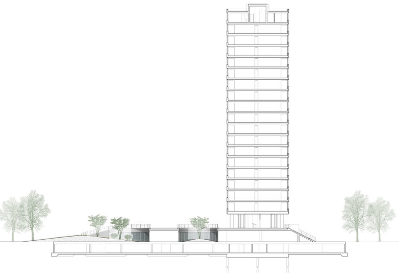 Die Wohnscheibe sitzt auf dem eingeschossigen Sockelbau, der zum See und zum Verbindungsweg zwischen Arbon und Steinach flach abfällt. Über geschwungene Treppen und einen leicht ansteigenden Weg erreicht man das ‚Belvedere’, von wo sich bereits eine schöne Seesicht erleben lässt. An diesem durch seine erhöhte Lage ausgezeichneten Ort sind eine Bar und zwei Clubräume für die Bewohner vorgesehen. Gleichzeitig befinden sich hier auch die oberen Ausgänge aus den doppelgeschossigen Eingangslobbies.