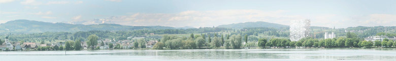 Die vorgeschlagene Scheibe reagiert auf verschiedenen Ebenen präzise auf die vorgefundene Situation. Richtung Arbon und Steinach erscheint sie als schmaler eleganter Baukörper, zur Weite des Sees hin zeigt sie ihre breite Seite. Die Fassade mit unterschiedlich weissen, opaken und durchsichtigen Gläsern spiegelt die umgebende Landschaft und die Benachbarten Gebäude, den See und die Wolken. Das elegante Spiel von Transparenz und Tiefe bricht dabei die Dimension des Baukörpers.