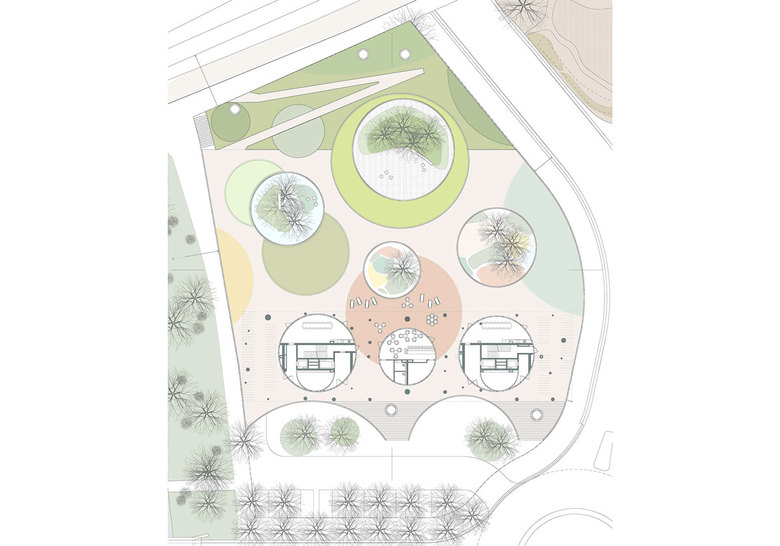 Zur Stickereistrasse ist der Baukörper ebenfalls zurückgesetzt und schafft an deren Ende eine Ausweitung des Strassenraumes. Damit wird der Kreisel räumlich aufgewertet und die Stickereistrasse findet in einem baumbestandenen Platz ihren Abschluss. Die beiden doppelgeschossigen Eingangslobbies bilden hier eine klare Adresse sowohl für die Wohnungen als auch die Büros.