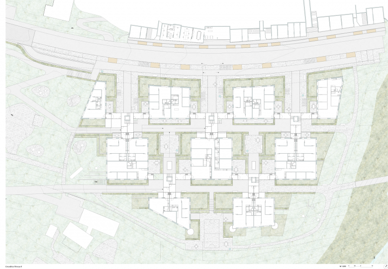 Der Wohnungsmix mit 2 ½ bis 6 ½ Zimmerwohnungen, die ergänzenden drei Clusterwohnungen und die vier Jokerzimmer im mittleren Haus lassen eine vielfältige Bewohnerschaft erwarten. Neben Familien mit Kindern, älteren Paaren und Alleinstehenden werden auch Wohngemeinschaften die Siedlung bewohnen. Die Wohnnutzung wird durch verschiedene gemeinschaftliche Einrichtungen ergänzt. An der Hochhüsliweidstrasse bilden die drei offenen Plätze den Auftakt zur Siedlung. Vis-à-vis sind in den umgenutzten Garagen der bestehenden Siedlung der SBL kleine Werkstätten, Hobbyräume und eine Velowerkstatt untergebracht, welche durch eine Cafétheke ergänzt wird und auch als Gemeinschaftsraum genutzt werden kann. Der Co-Working-Space ist ebenfalls hier vorgesehen, alternativ könnte er auch in der neuen Siedlung im Erdgeschoss des Hauses 2 statt der 5-½ Zimmerwohnung untergebracht werden.