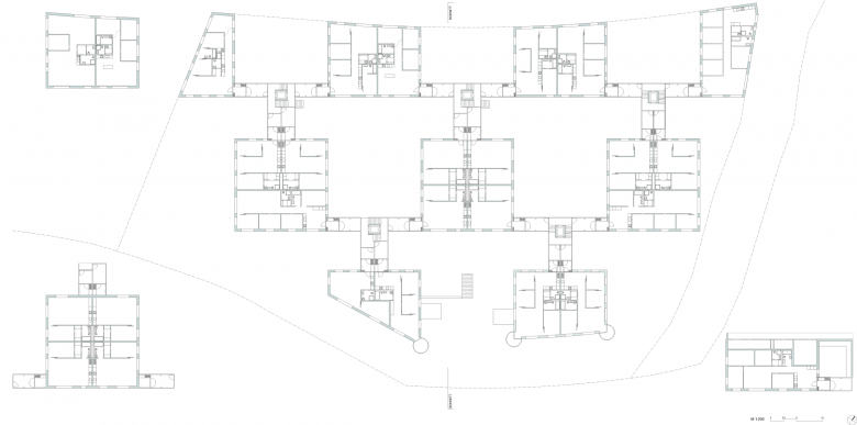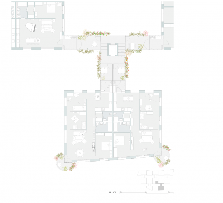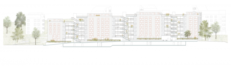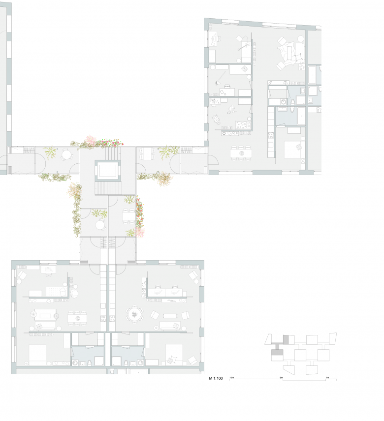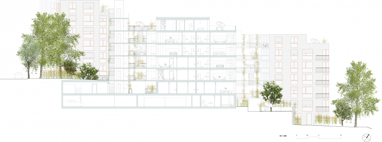 Die aussenliegenden Treppenanlagen und Lauben versprechen einen regen Austausch der Bewohner untereinander, gleichzeitig schaffen Balkonvorhänge und Pflanzenbewuchs einen Filter und gewährleisten die nötige Privatsphäre. Der Übergang vom öffentlichen und gemeinschaftlichen zum privaten Raum ist nuanciert ausformuliert.