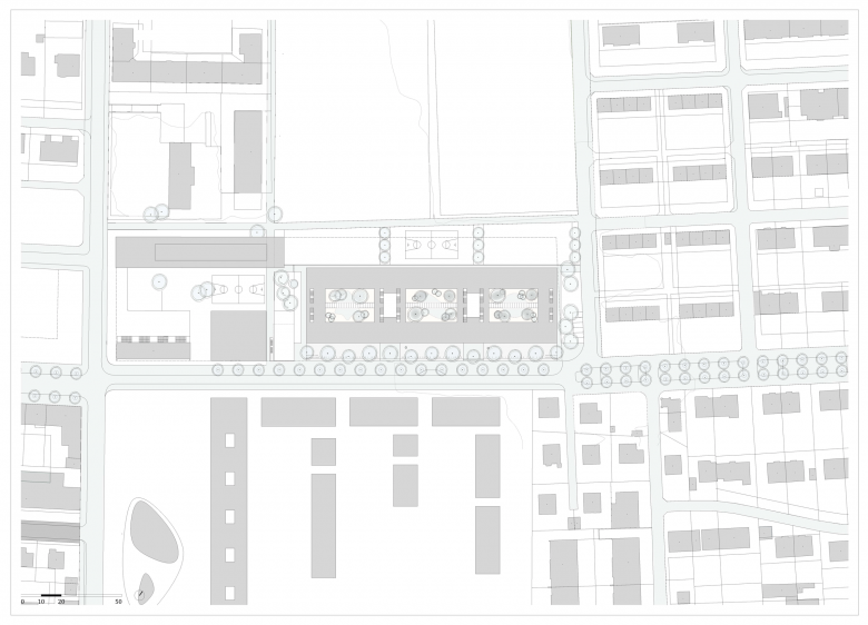 Das neue Schulhaus begleitet die Champagne-Allee auf der gesamten Länge des bebaubaren Feldes in angemessenem Abstand und definiert in diesem Abschnitt den Strassenraum tatsächlich als Allee. Eine zusätzliche Baumreihe - dem Gebäude vorgelagert - unterstreicht diesen Alleen-Charakter.