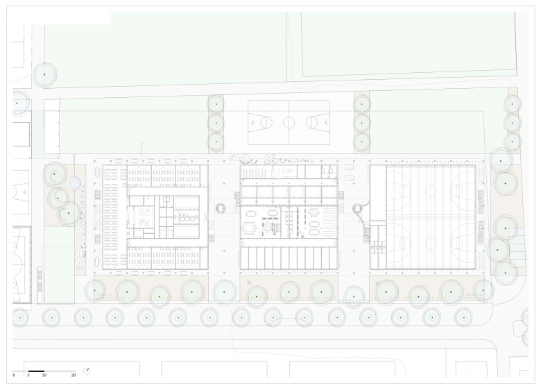 Der Fussabdruck des Erdgeschosses umfasst drei voneinander getrennte etwa gleichgrosse, beinahe quadratische Volumen. Sie beinhalten jeweils verschiedene Programmteile: Eine Mensa im östlichen Teil, die Schulleitung und die Fussballinfrastruktur im mittleren und die Turnhalle im westlichen Teil. Die beiden darüberliegenden Langbauten beherbergen im 1. Obergeschoss die Unterrichtsräume des Zyklus 1 und im zweiten Obergeschoss jene des 2. Zyklus. Die einfachen , überlagerten Gebäudevolumen sind mit Aussentreppen, schützenden Dächern, Terrassen und schattenspendenenden Pergola-Gerüsten miteinander verwoben. Es entsteht ein dreidimensionales Wegegeflecht, das die verschiedenen Programmpunkte in einem einzigen Haus zusammenfasst und diese sowohl miteinander verbindet als auch den einzelnen Teilen jeweils eine eigene Umgebung schafft. Es entsteht ein Spiel zwischen Volumen und lichtspendenden Leerstellen.