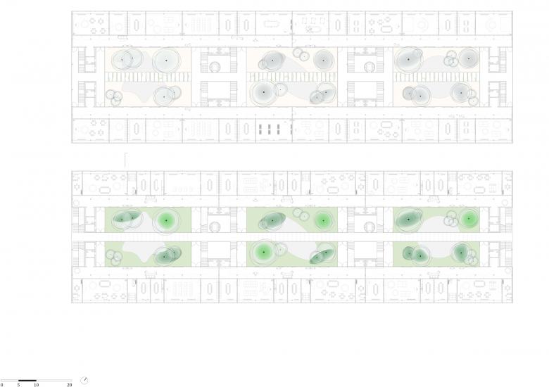 Wiewohl das dreigeschossige Gebäude beinahe das ganze Baufeld besetzt, ist es durchlässig und eröffnet für diesen Teil der Stadt ein überkreuztes Wegenetz, das sich auf zwei unterschiedlichen Ebenen überlagert: