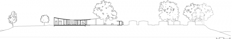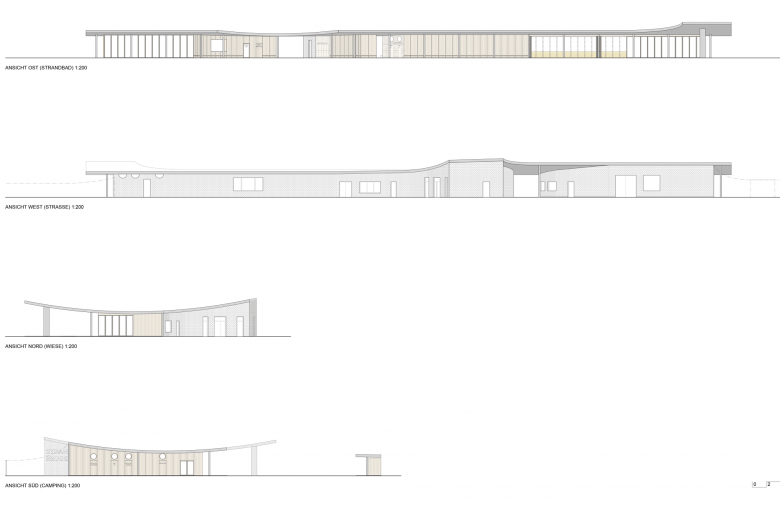 Im Strandbad wird die Gliederung des langgestreckten Gebäudes mittels der eingeführten Geometrie des Kreises weitergeführt. Ein den Besucher elegant umarmendes Halbrund schafft einen Ankunftsort. Das prägnant vorstehende Dach am Ende des Gebäudes bildet einen Abschluss und schafft einen Übergang zu den Baumkronen der Liegewiese. Die Nutzwiese wird auf der gegenüberliegenden Seite von den Familienkabinen entlang der dahinterliegenden bestehenden Hecke gefasst.