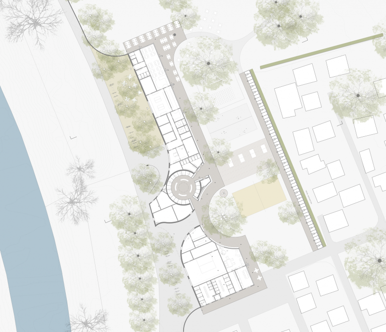 Das neue Gebäude des Strandbads Bruggerhorn orientiert sich entlang der Strasse. Die durch das Baurecht vorgegebenen Abstandsvorschriften von Wald und Strasse formen das Volumen und gliedern die zugehörigen Aussenräume auf sinnvolle Weise in einen Vorplatz/ Eingangsbereich, eine Zufahrt für Anlieferung und Entsorgung, sowie einen strassenseitigen Zugang zum Restaurant mit zusätzlichen Sitzplätzen für Spaziergänger, Velofahrer und Rheintal-Binnenkanal-Böötler, die auf ihrem Weg entlang des Rheins hier Halt machen können.
