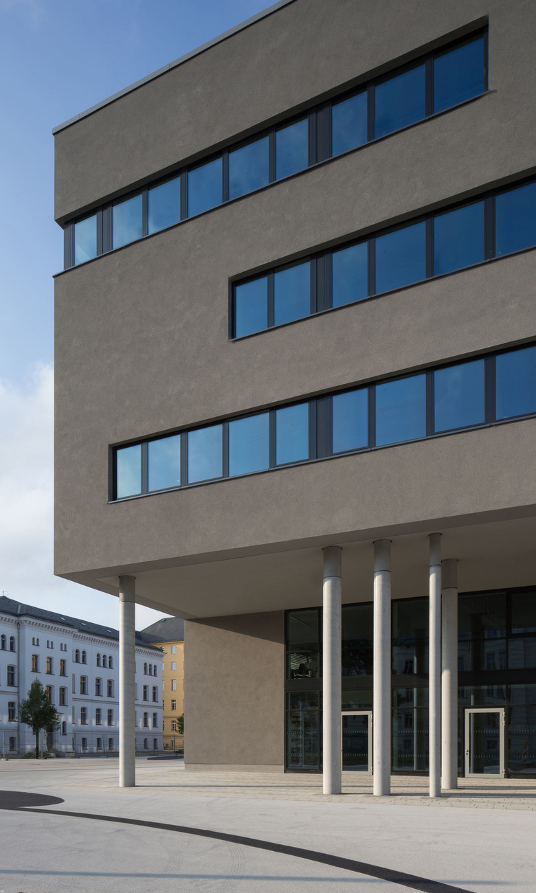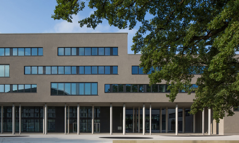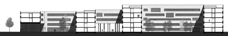 Nicht nur im Grundriss, sondern auch in der Höhenentwicklung gestaltet sich der Baukörper vielschichtig und variationsreich. Die Straßenseite nimmt die umgebenden Höhen auf, im Blockinneren wird das Gebäude höher. Es duckt sich, um dahinterliegenden Bereichen Ausblicke zu gewähren, es hebt sich, um darunter hindurchgehen zu können.