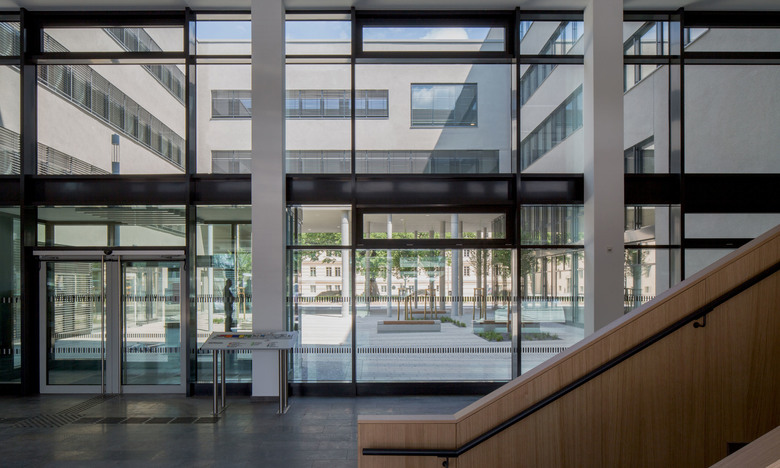 Das Innere des Gebäudes ist geprägt von der klaren Organisationsstruktur der Verwaltungsbereiche, durchbricht aber immer wieder das Serielle und lässt Raum für Kommunikation und Austausch. Die öffentlichen Bereiche mit Veranstaltungssaal und Bibliothek befinden sich einfach zugänglich im Erdgeschoß. Farb- und Materialkonzept unterstreichen durch erdige Töne und Holzoberflächen sowie Glas die positive warme Atmosphäre des Hauses sowie Offenheit und Bürgernähe der Ministerien.