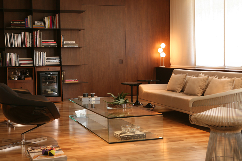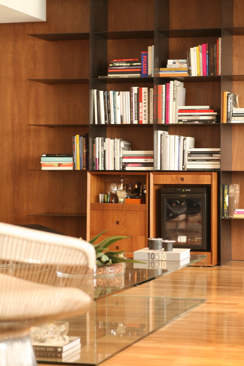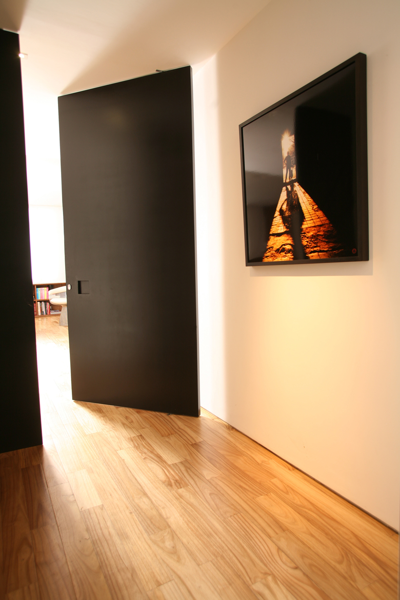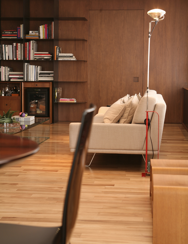 The wood was used in abundance, including a panel that separes living and family room, with door of running embedded and shelving in iron plate.