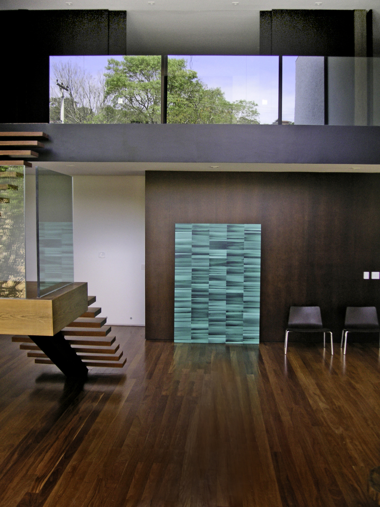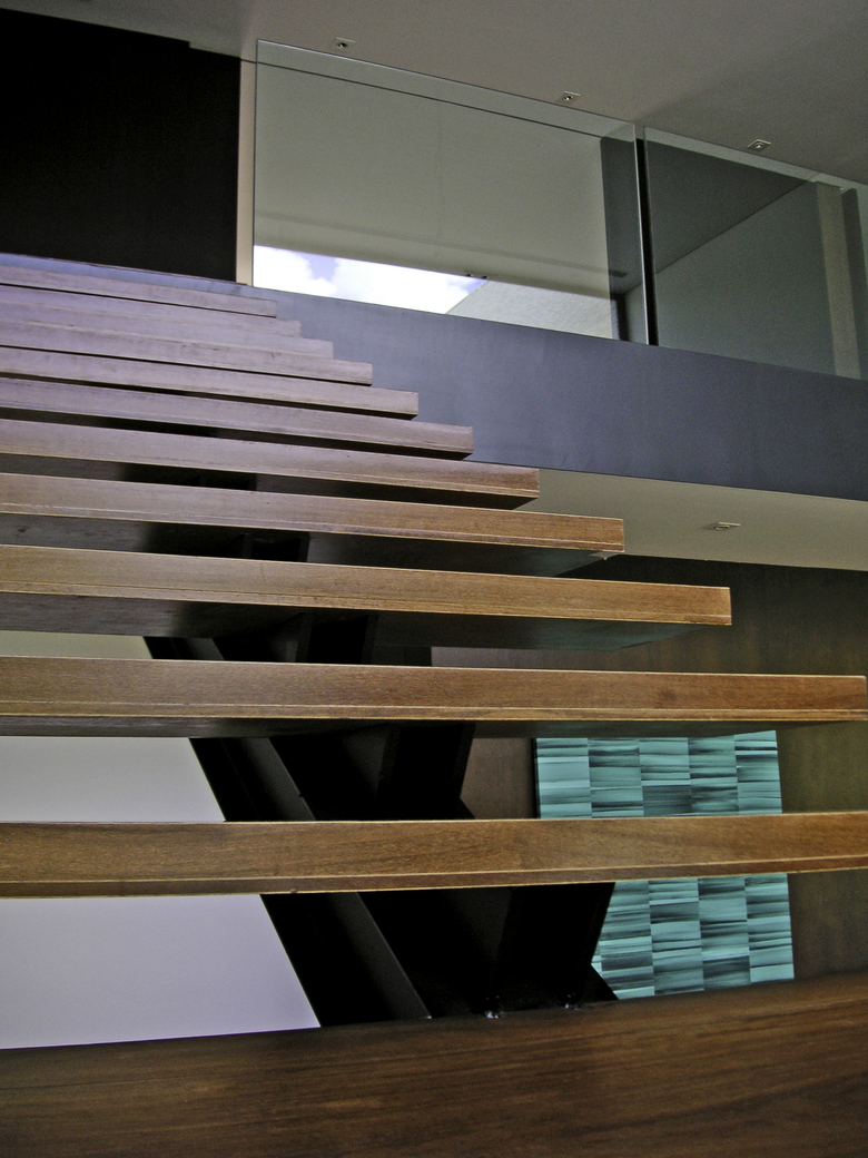 The social stair, set on the 7,00 meters high entrance galery, is a large and hanging slim steel structure, covered with wood, that gives a dramatic spacial idea.