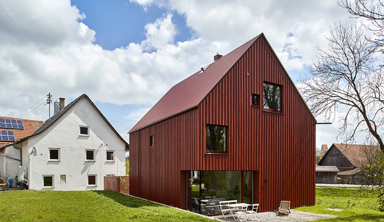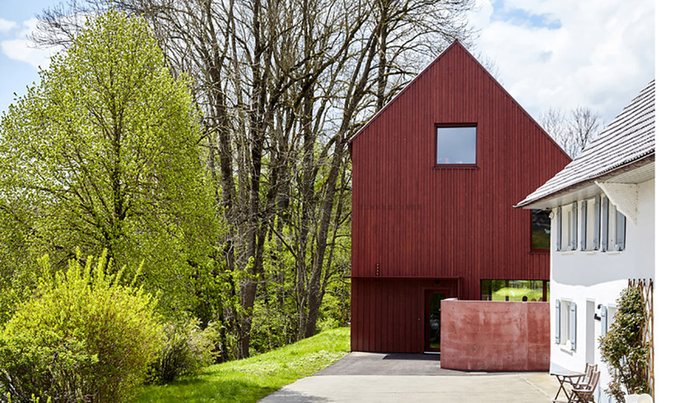 Alles das ist ein Haus – und manchmal ist es mehr. Nähert man sich Illerbeuern von Osten, so mischt sich unter die ersten Häuser eines, das ins Auge springt, im Vorbei-fahren, aus dem Augenwinkel fesselt. Man bremst, stößt zurück, steht vor dem Bau: Die Silouette eines Hauses mit steilem Dach, Fenstern und Tür. Zeitlos, traumhaft – betont durch die Farbe: Rot!.