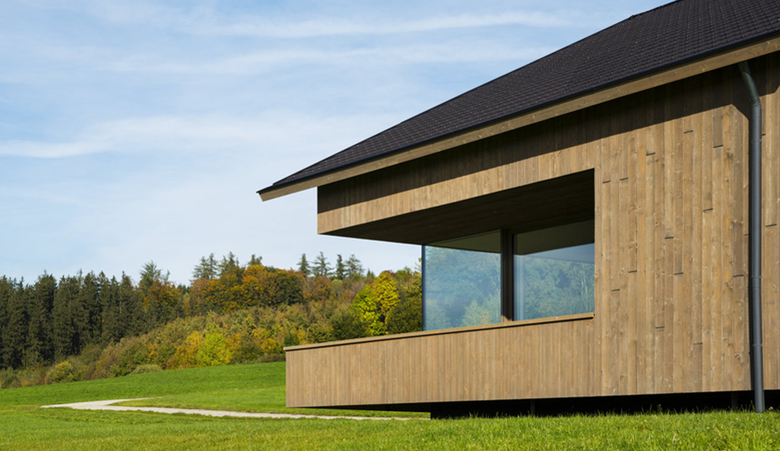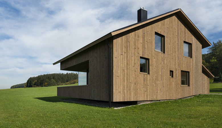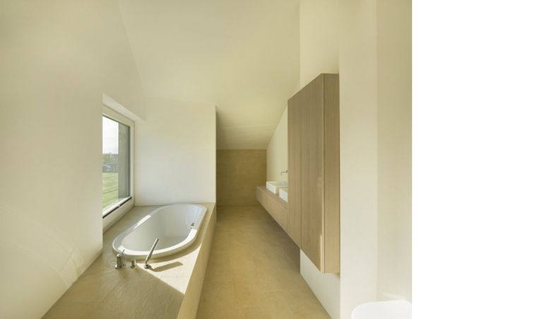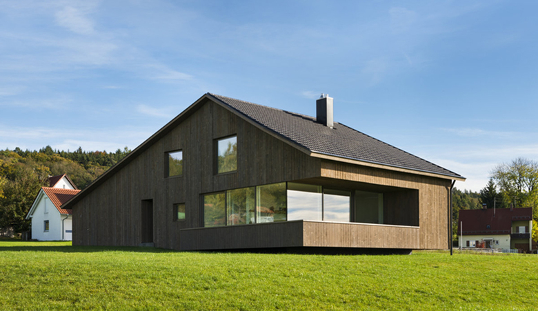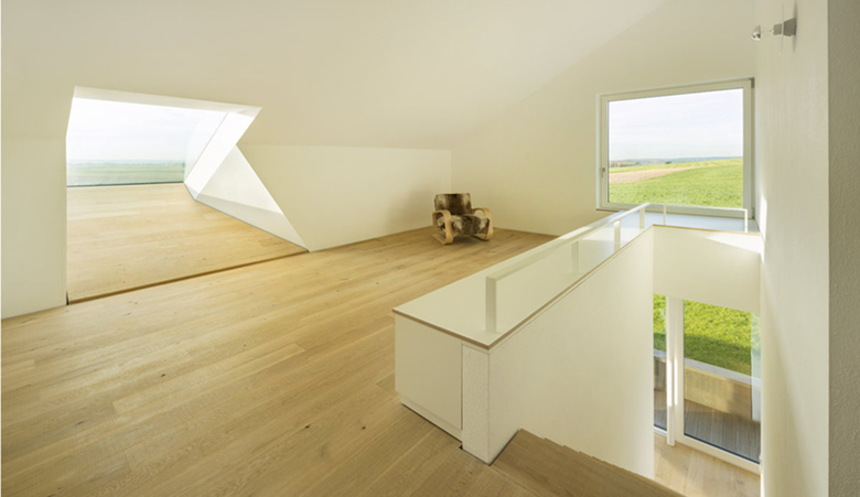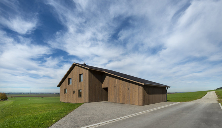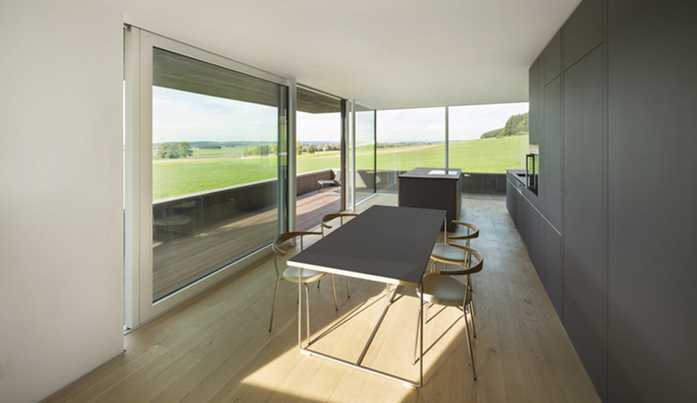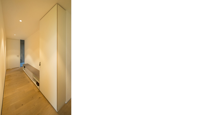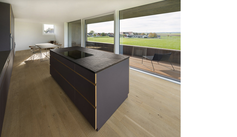 Am nördlichen Ortsrand von Boos, mit unverbaubarem Blick ins Illertal entstand dieses Haus als Ortsrandabschluß im Übergang zur freien Landschaft. Gehört das Haus noch zum Dorf oder ist es doch schon der Landschaft zuzurechnen? In Form, Materialität und Bezug zum Aussenraum wird dieser Wechsel thematisiert. Die Garage wird unters Hausdach integriert, ein einziger Baukörper steht ohne die typischen Einfamilienhausattribute wie Gartenzaun und Terrasse in der Landschaft. Die Orientierung des Wohnraums im Erdgeschoss mit Küche und Essplatz ist über die raumhohe Verglasung mit vorgelagerter Loggia nach Norden und Westen ins unverbaubare Illertal orientiert. Die Größe des Grundstücks ermöglicht zudem einen sonnigen privaten Gartenplatz auf der Nordseite des Hauses.