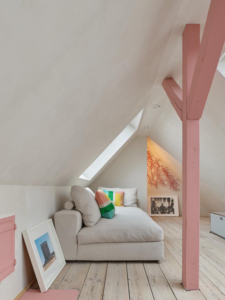 Die Material- und Farbwahl folgt einer klaren gestalterischen Linie: Natürlichkeit, Lebendigkeit und Ausdrucksstärke. Unbehandelte, gelaugte Douglasien-Dielen aus dem Schwarzwald schaffen eine warme Basis. Das schwarze MDF des Treppenmöbels, lachsrot gestrichene Dachbalken sowie abgestimmte Wandfarben und Textilien setzen Kontraste. Alles wurde bewusst gewählt, um eine Atmosphäre zu schaffen, die zugleich ruhig und kraftvoll wirkt – zurückhaltend und doch markant.
