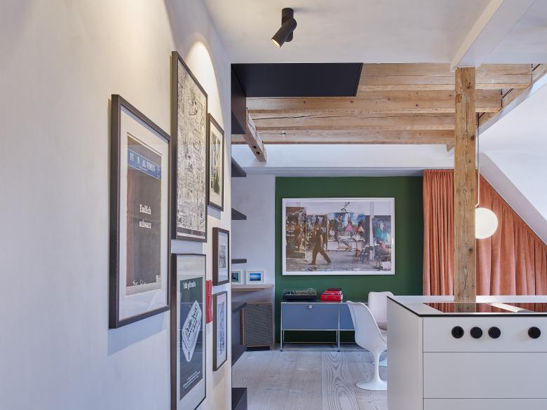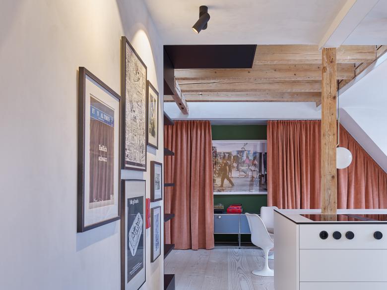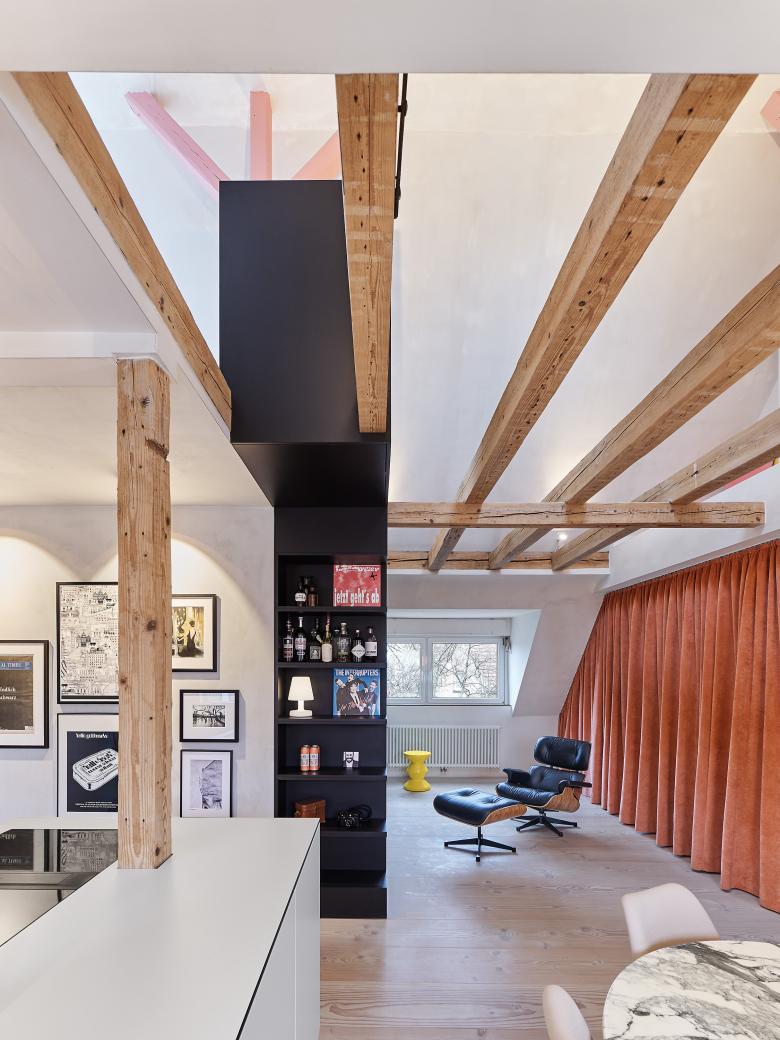 Ein Regal wird zur Treppe, das Badezimmer verbirgt sich hinter einer Schranktür, und der Arbeitsraum öffnet sich theatralisch hinter einem Vorhang. Als ikonischer Moment öffnet ein großflächiges Dachfenster den Blick auf den Stuttgarter Fernsehturm. In einem unscheinbaren Mehrfamilienhaus aus den 1930er-Jahren entsteht ein ebenso überraschendes wie durchdachtes Kleinod, das sich mutig von konventionellen Wohnstrukturen löst.