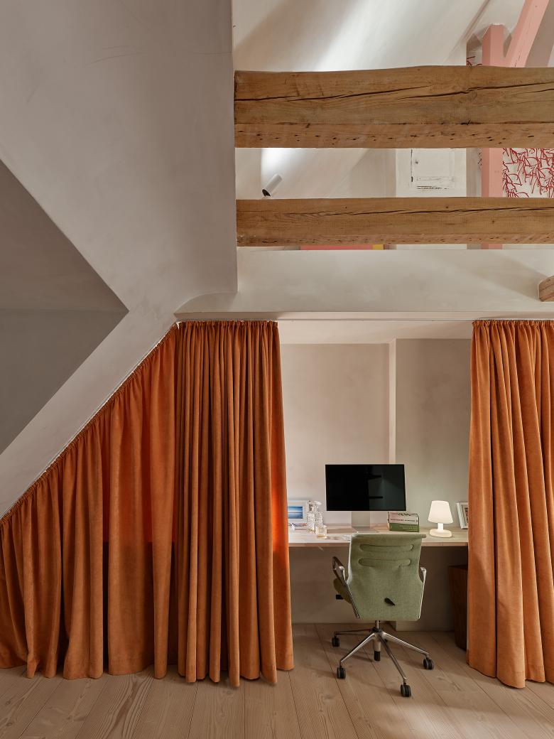Den räumlichen Abschluss zum Nachbargebäude bildet eine raumbreite Vorhangwand, die sowohl akustisch als auch visuell wirkt. Sie lässt sich öffnen und gibt einen Arbeitsplatz sowie Stauraum frei – flexibel nutzbar je nach Tageszeit oder Stimmung. Der Raum erhält so ein wandelbares zweites Gesicht: mal Bibliothek, mal Büro, mal ruhiger Rückzugsort. Textile Elemente übernehmen dabei die Rolle klassischer Türen und Wände – mit Leichtigkeit und Eleganz.