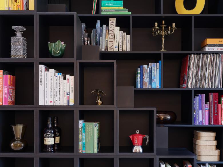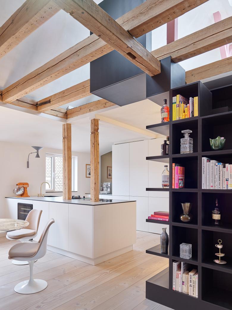 Ein aus schwarzem MDF gefertigtes Raummöbel erschließt als begehbares Regal den Wohnbereich im Spitzboden. Die zuvor abgetrennte Decke wurde auf ihre Balkenlage zurückgebaut, sodass ein neuer Raumbezug zwischen Ess-, Arbeits- und oberen Wohnbereichen entsteht. Der Spitzboden, einst reine Abstellfläche, wurde über gezielte Dachöffnungen aufgewertet und lädt heute mit Ausblick auf die Weinberge und den Fernsehturm zum Verweilen ein – ein Ort zwischen Geborgenheit und Weite.