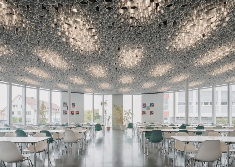 Die neue Mensa des Schulzentrums Stadtmitte ist Dreh- und Angelpunkt des gemeinsamen Schullebens, Treff- und Sammelpunkt, Ort der Begegnung und des gemeinsamen Essens. Als zentrale Anlaufstelle wird die Mensa für alle drei Schulen zum gemeinsamen identitätstiftenden Ort. Die vielfältigen Nutzungsanforderungen des sozialen Schullebens werden durch verschiedene Bereiche erfüllt, die sich über die gesamte Platzfläche zwischen zwei der drei Schulen verteilen – es bildet sich ein räumlich funktionales Kontinuum zwischen Innen und Außen.