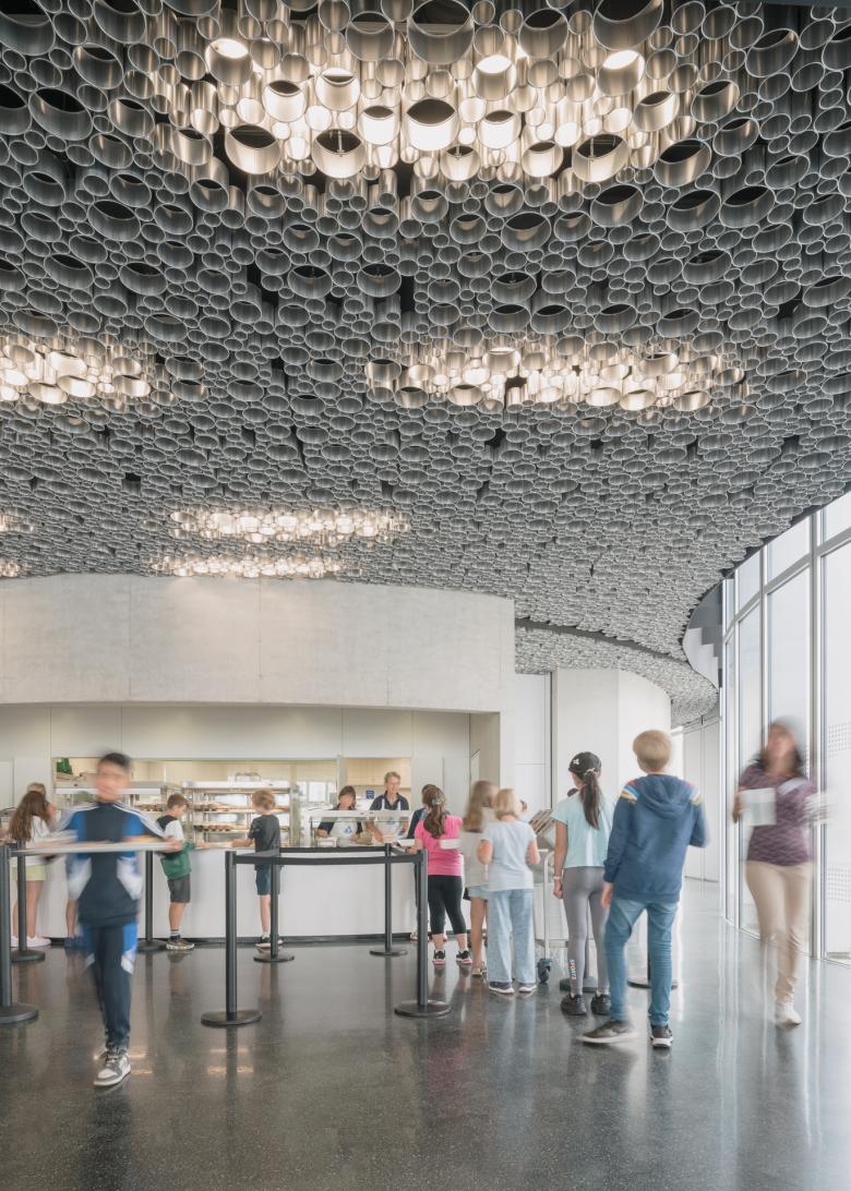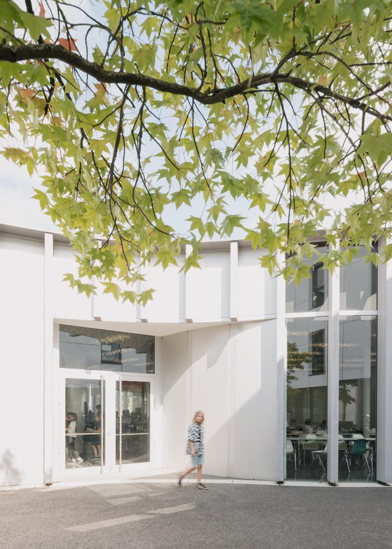 Mehr Platz als Haus Anstatt die heterogene städtebauliche Struktur des Schulzentrums fortzusetzen, versteht sich die neue Mensa als Platz zwischen den Bestandsgebäuden. Am westlichen Platzende befindet sich der Funktionsbereich sowie die Anlieferung, während sich die Speisebereiche zum südlichen und östlichen Teil des Platzes orientieren. Am nordöstlichen Ende erfolgt der Hauptzugang von der Straße. Nach Südosten öffnet sich die Fläche zum Grünbereich zwischen den Schulen.