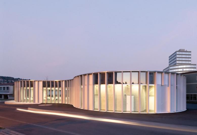 Wirtschaftlichkeit – Die kompakte Anordnung der Funktionsbereiche sowie verschiedene effiziente Bestuhlungsvarianten ermöglichen gleichzeitig die Aufwertung der Bewegungsflächen bei einer geringen Gesamtfläche. Die Reduktion auf wenige unterschiedliche Elemente sowohl im Bereich des Tragwerks als auch der Fassade erlaubt einen hohen Grad an industrieller Vorfertigung in hoher Stückzahl. Die äußeren Holzstützen sind sowohl Konstruktion als auch Teil der Fassade. Der Funktionskern übernimmt die Gebäudeaussteifung. Als thermische Hülle wechseln sich jeweils identische verglaste und geschlossene, gedämmte Elemente in loser Folge ab.