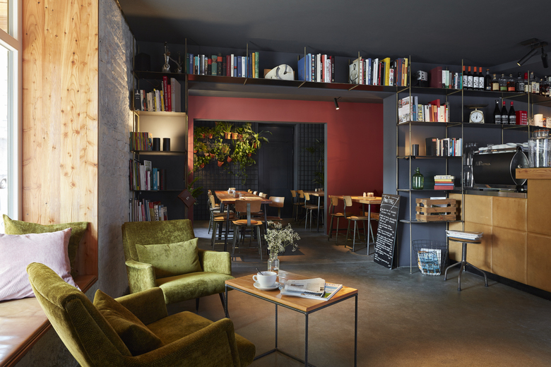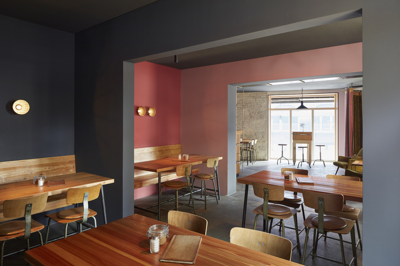 Das in drei Teilräume gegliederte Lokal – einen Hauptgastraum mit Theke sowie zwei weitere kleinere, intimere Raumbereiche – bietet den Gästen ein gut abgestimmtes Angebot an Sitzmöglichkeiten, vom informellen Zusammenkommen im Loungebereich, der sich um eine tiefe hölzerne Sitznische in der Fensterleitung zum Platz orientiert, sowie an der mit Rindslederpanels bekleideten Bar, die den Hauptraum dominiert, bis hin zu intimen Sitznischen mit einfachen Bänken aus gebürstetem Lächenholz. Im hinteren der beiden kleinen Räume bilden an einfachen Bewehrungsmatten in Tontöpfen aufgehängte Grünpflanzen ein lebendiges und natürliches Wandbild, das sich klar vor dem schwarzen Wandhintergrund abzeichnet.