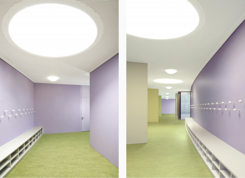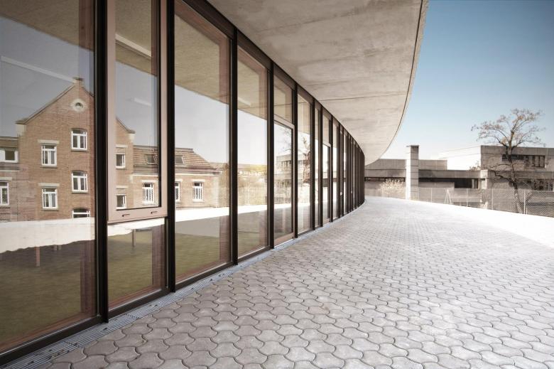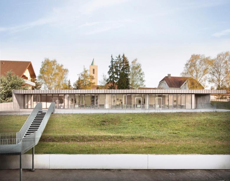 Seine massive, geschlossene Betonwand, mit dem Bild einer rauen Brettschalung, schirmt von der rückwärtigen Straße ab. Im Gegensatz dazu öffnet sich das Gebäude talseitig zum Altbau der Pestalozzischule mit einer großzügigen Glasfassade. Dadurch wird sowohl ein visueller wie auch nachhaltiger Bezug zwischen Alt- und Neubau, zwischen den Schülern sowie dem Innen und Außen, hergestellt. Im Inneren gliedern drei eingestellte Körper, in welchen sich die dienenden Funktionen befinden, den Raum in Flurbereich und Klassenzimmer. Vom Eingang des Gebäudes führt die fliederfarbene, geschwungene Garderobenwand in den Raum. Sie setzt ein farblich komplementäres Gegengewicht zum grünen Linoleumboden sowie den übrigen Wandflächen, welche über eine Abfolge intensiver werdender Grüntöne die einzelnen Klassenräume adressieren. Dieser lebendige Farbraum ist sowohl Erschließungsfläche der Klassen- und Nebenräume als auch erweiterter Spiel- und Aufenthaltsflur für die Kinder. Das Gefühl von geborgener Offenheit wird erreicht durch die räumliche Erweiterung des Flurs zu dem geschützten Innenhof, der als “grünes” Klassenzimmer einen Puffer zwischen Straße und Innenraum bildet und den Flurbereich über eine Glasfassade mit natürlichem Licht versorgt. Alle Klassenräume orientieren sich zum Schulhof sowie zum Altbau. Während sich der grüne Linoleumboden aus dem Flur in die Räume fortsetzt, bleiben die Wände farblich neutral, um eine konzentrierte Lernatmosphäre zu schaffen. Lediglich die flurseitigen Wände nehmen Bezug auf den jeweils den Räumen zugeordneten Grünton. Großzügige raumbildende Oberlichter in den Klassenräumen ermöglichen eine lernfreundliche natürliche Belichtung und somit den weitgehenden Verzicht auf künstliches Licht während der Unterrichszeiten. Weitere Oberlichter sorgen im geschützten Garderobenbereich des Flurs für eine angenehme Atmosphäre. Die massive Hülle des Gebäudes besteht aus einer zweischaligen Ortbetonkonstruktion mit Kerndämmung. Die Oberfläche der nichttragenden Außenschale wurde durch Abwandlung einer traditionellen Stülpschalung hergestellt. Es wurden drei, in Stärke und Breite variierende Brettgrößen verwendet. Keilförmige Brettzuschnitte, welche in regelmäßigen Abständen eingesetzt wurden, bewirken das graduelle Kippen des Fassadenbildes gegen den Hang. Unter dem Einsatz von sägerauen Brettern entsteht so eine lebendige Textur. Durch den angemessenen Umgang mit dem Ort konnten die Architekten einen wertvollen Beitrag zu einer neuen, innovativen Schularchitektur leisten.