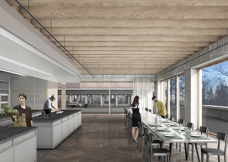 Das zweigeschossige Akademiegebäude ist so in die Topographie hinein gesetzt, dass direkte Beziehungen von beiden Geschossen zum Aussenraum ermöglicht werden, im Erdgeschoss zum gemein- samen Hof, im Obergeschoss zum rückwertigen Garten. Im Erdgeschoss sind die eher öffentlichen Funktionen untergebracht wie der Empfang und das Sensorium, das Mysterium und das Refektorium mit den dazugehörenden Küchen und dem Lager. Dagegen sind die Schulungsräume mit ihren Küchen, die Medienschulung wie auch die Schulverwaltung und der Coworkingspace im Obergeschoss angeordnet. Zentraler Raum, der Bauch des Gebäudes, ist der Speisesaal, das Refektorium. Hier wird gegessen, gewohnt und auch gearbeitet, oder man trifft sich abends am Kaminfeuer. Hier werden auch Schweine gebraten, Feste gefeiert und Bankette veranstaltet. Gekocht wird in der offenen Akademieküche, bei speziellen Anlässen auch in der Mysterium-Küche. Neben der Akademieküche, vom Hof aus gut sichtbar, sind die Micro-Einrichtungen angeordnet; die Käserei, die Fleischerei, die Bäckerei und die Patisserie. Diese sind damit auch Teil des Sensoriums, dem eigentlichen Schaufenster der Kochakademie. Hier werden Materialien gezeigt und regionale Produkte ausgestellt und verkauft, Gäste empfangen, Apéros veranstaltet aber auch destilliert und gebraut. Im benachbarten Mysterium wird das Kochen möglichst nahe zu den Gästen gebracht. Die offene Küche wird zur Bühne der jungen Köchinnen und Köche und ihrer Kunst. In den Sommermonaten kann das Mysterium auch nach Draussen verlegt werden. Gekocht wird dann im Freien. Auf der Mysterium-Kanzel gleich neben dem Kräutergarten können die Gäste dem Kochspektakel zusehen und dabei die kühle Abendluft und den Blick in die Landschaft geniessen. Andere mögliche Essplätze im Freien sind im Hofbereich oder vor der Akademieküche mit Blick ins Dorf zu finden.