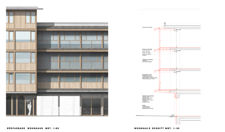 Der neue Kopfbau ist Dreh- und Mittelpunkt nicht nur des Wohngebäudes sondern der ganzen Anlage. Er organisiert die Erschliessung des Wohngebäudes, beherbergt nebst den Dozentenzimmern die zentral gelegenen Gemeinschaftsräume und vermittelt zwischen den beiden Gebäuden, dem Wohnen und der Akademie. Seine Konturen gliedern den zentralen Hof in verschiedene Zonen, in einen Eingangs- und Anlieferungsbereich und einen Werkhofbereich mit der Verbindung in den nördlich gelegenen Garten. Im Erdgeschoss ist das Wohngebäude ganz auf den Hof gerichtet. Nebst dem Zu- gang zum Gebäude und der Tiefgarage sind es die Orangerie wie auch die nordöstlich anschliessenden Werkstätten, welche den gemeinsamen Hof zusätzlich beleben. Die Fassaden wie auch die neuen Lauben sind aus lokalem Holz gefertigt. Die grossen Vordächer schützen die nach aussen öffnen- den Fenster und beziehen sich in ihrer Ausformulierung auf traditionelle Bauten der Region.
