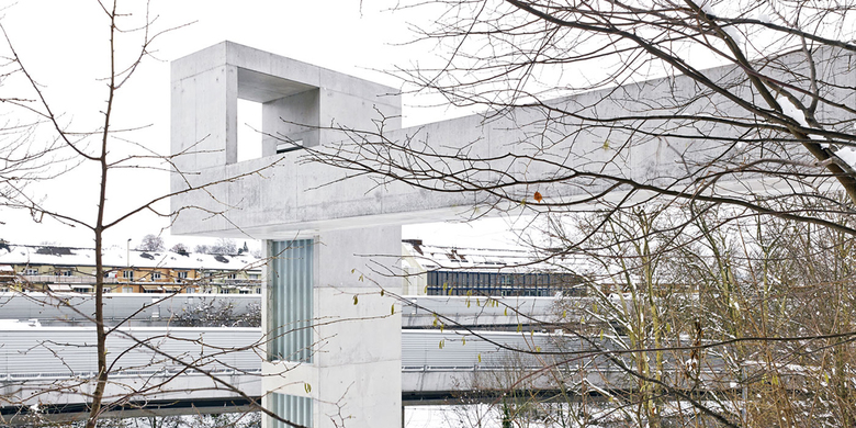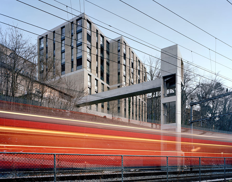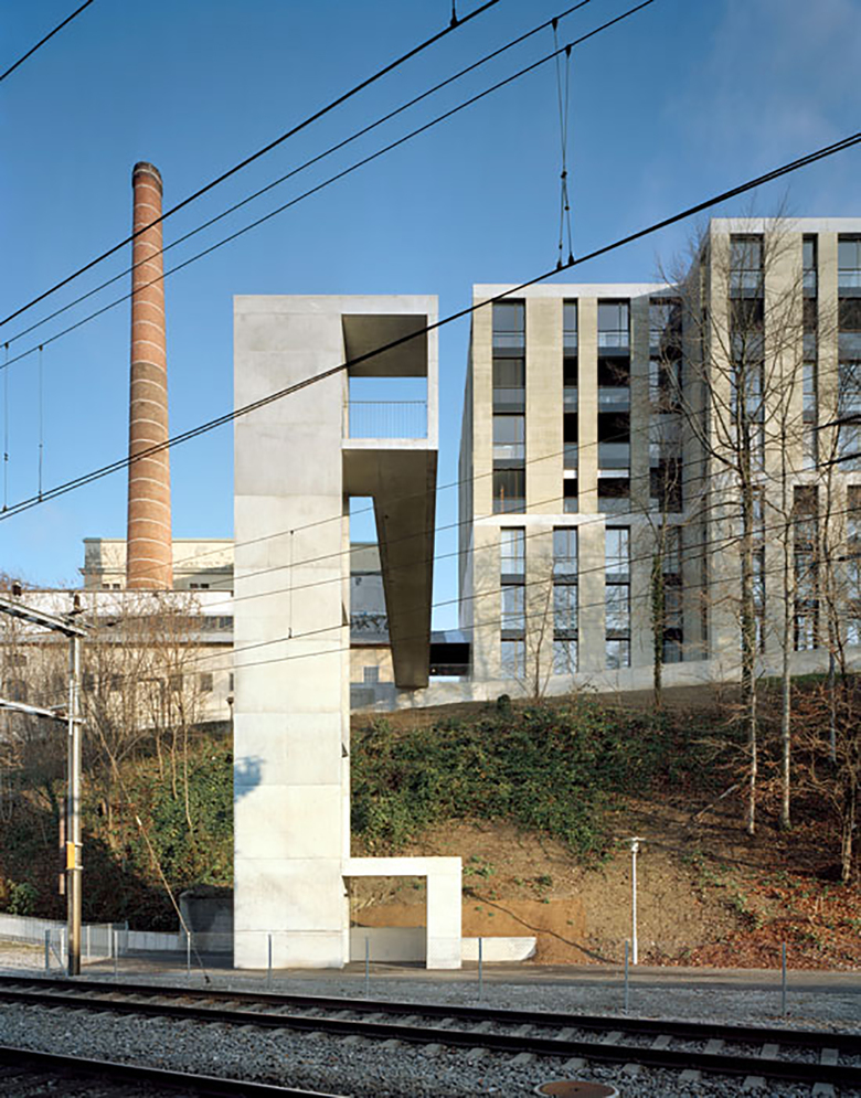 Eine neue Liftanlage verbindet die Berganlage mit dem 15 Meter tiefer gelegenen Sihltal und der S-Bahnstation Giesshübel. Sie besteht aus einem weitgespannten Steg und einem Turm. Diese beiden Elemente, in Beton gegossen, betonen den skulpturalen Charakter der Anlage und zeichnen die Choreographie der Verbindung nach.