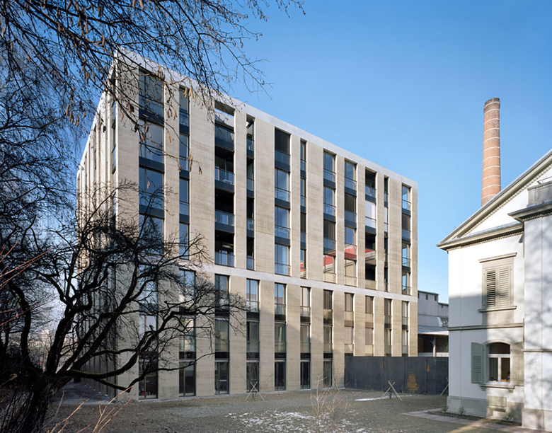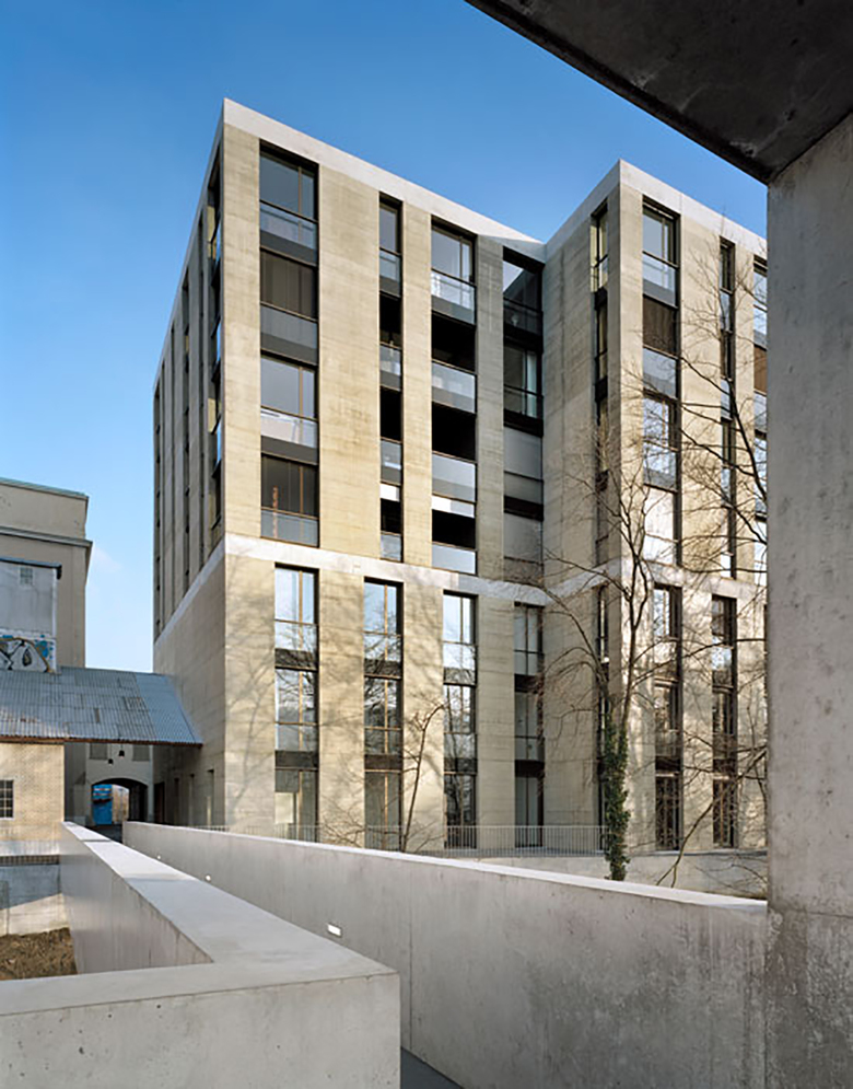 Der Malzturm ist das oberste Element der westlichen Gebäudesilhouette, ein monolithischer Baukörper, der die äussere Berganlage abschliesst. Seine Kantigkeit und seine feingliedrige, vertikale Fassadenstruktur sollen an den geschlossenen, monolithischen Silobau erinnern, den er ersetzt. Mit der Fassadengliederung und der Farb- und Materialwahl übernimmt der Neubau markante Eigenschaften des ehemaligen Silobaus. Der Neubau umfasst sieben Obergeschosse, welche durch eine „Taille" in zwei unterschiedlich grosse Gebäudehälften geteilt sind. Im oberen Gebäudeteil sind Geschosswohnungen in unterschiedlicher Grösse untergebracht. Die unteren drei Geschosse beinhalten Lofts und Maisonettewohnungen. In den zwei Untergeschossen befinden sich die Wohnungskeller und eine zweigeschossige Tiefgarage für 30 Parkplätze. Sie wird über einen Autolift erschlossen. Die Statik des Gebäudes ist klar und einfach organisiert. Fassade sowie Kern des Gebäudes sind tragend, der Raum dazwischen frei unterteilbar. Diese einfache Gebäudestruktur bildet die nötige bauliche Flexibilität für die vielfältigen Ausbauwünsche der Wohneigentümer. Sie wird durch die Lage der Haustechnik im Gebäudekern noch unterstützt. Die vertikal gegliederten Fassaden des Gebäudes bestehen aus gelblich eingefärbten Sichtbetonbändern und dazwischen liegenden bronzenfarbenen Metallfenstern. Die Betonfassaden sind tragend und innenisoliert, die Fensterfronten grossflächig und geschosshoch. Sie bringen viel Licht in die ohnehin schon hohen, grosszügigen Wohnungen. Für die Wohnräume sind helle Wände, dunkle, schwere Parkettböden und leichte, verschiebbare Holzfronten im Kernbereich vorgesehen. Das über die ganze Höhe offene, in der Gebäudetaille aber um einen Lauf verschobene Treppenhaus ist wie die Aussenfassade aus Sichtbeton gestaltet und mit bronzefarbenen Metalltafeln verkleidet. Vertikal montierte Lichtstreifen rhythmisieren die innere Fassade und lassen den Raum in seiner gesamten Höhe erfahrbar werden.
