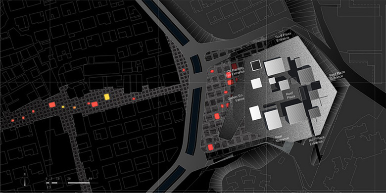 Therefore our strategy is to create a hybridized mix of different programs, like art museums, oil painting galleries and shops, commercial spaces, rental workshops, and studios under one roof. It also creates a maximum interaction among people by creating several pathways through the building’s public spaces.The museum is sandwiched by commercial and other public programs which intentionally allow for visual and spatial interactions among different functions. Exhibition, trade, painting, and residence can happen simultaneously, and can be interwoven into a whole new urban mechanism.