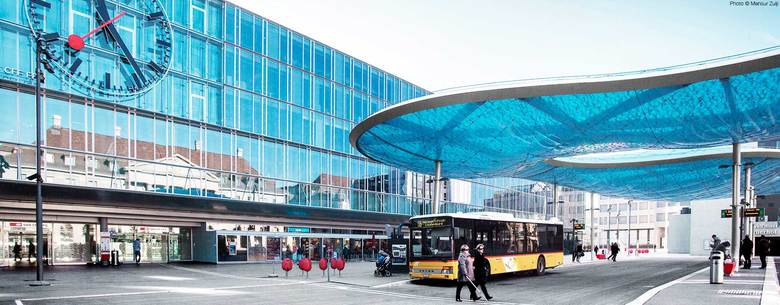 Ein zentraler Bushof auf dem Bahnhofplatz konzentriert neu alle Busse südlich der Bahnhofstrasse. Wie eine Waldlichtung spannt sich dort das filigrane, im Zentrum offene Luftkissendach über den Platz. Es schützt die Passanten, lässt aber genügend Luft, damit der Aufenthaltsbereich nicht wie eine geschlossene Halle wirkt.