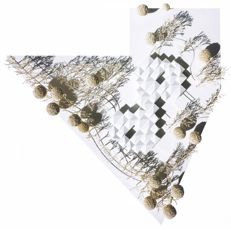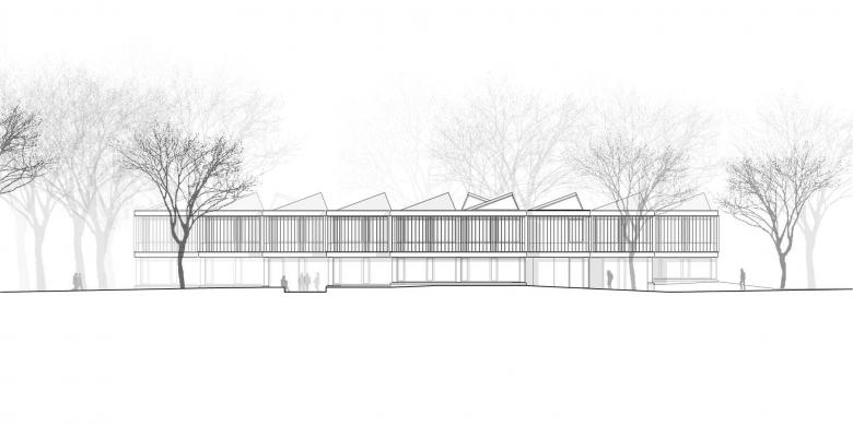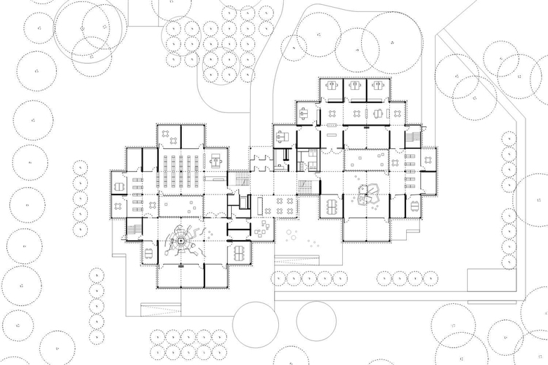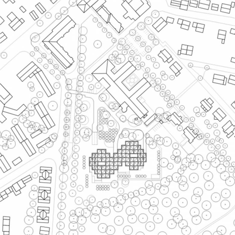 Der strukturalistische, clusterartige Entwurfsansatz drückt die Unruhe des Lernens aus - das ständige Suchen, Reflektieren, das Ausschweifen, das Neugierige, in alle Richtungen Schauende, dies trotz allem diszipliniert und mit systematischer Ordnung. Spielerisch fügt sich der Baukörper in das Baufenster und tritt durch die Diagonalstellung in Dialog mit dem Bestand. Die vielgliedrig gestufte Fassade erlaubt Ausblicke in mehrere Richtungen um das ‚lernende Suchen‘ zu ermöglichen.